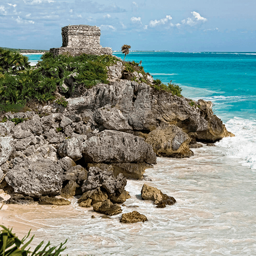 Ubicado en Quintana Roo, México, y las claras aguas del Caribe la rodean.